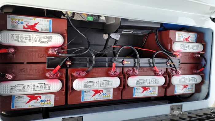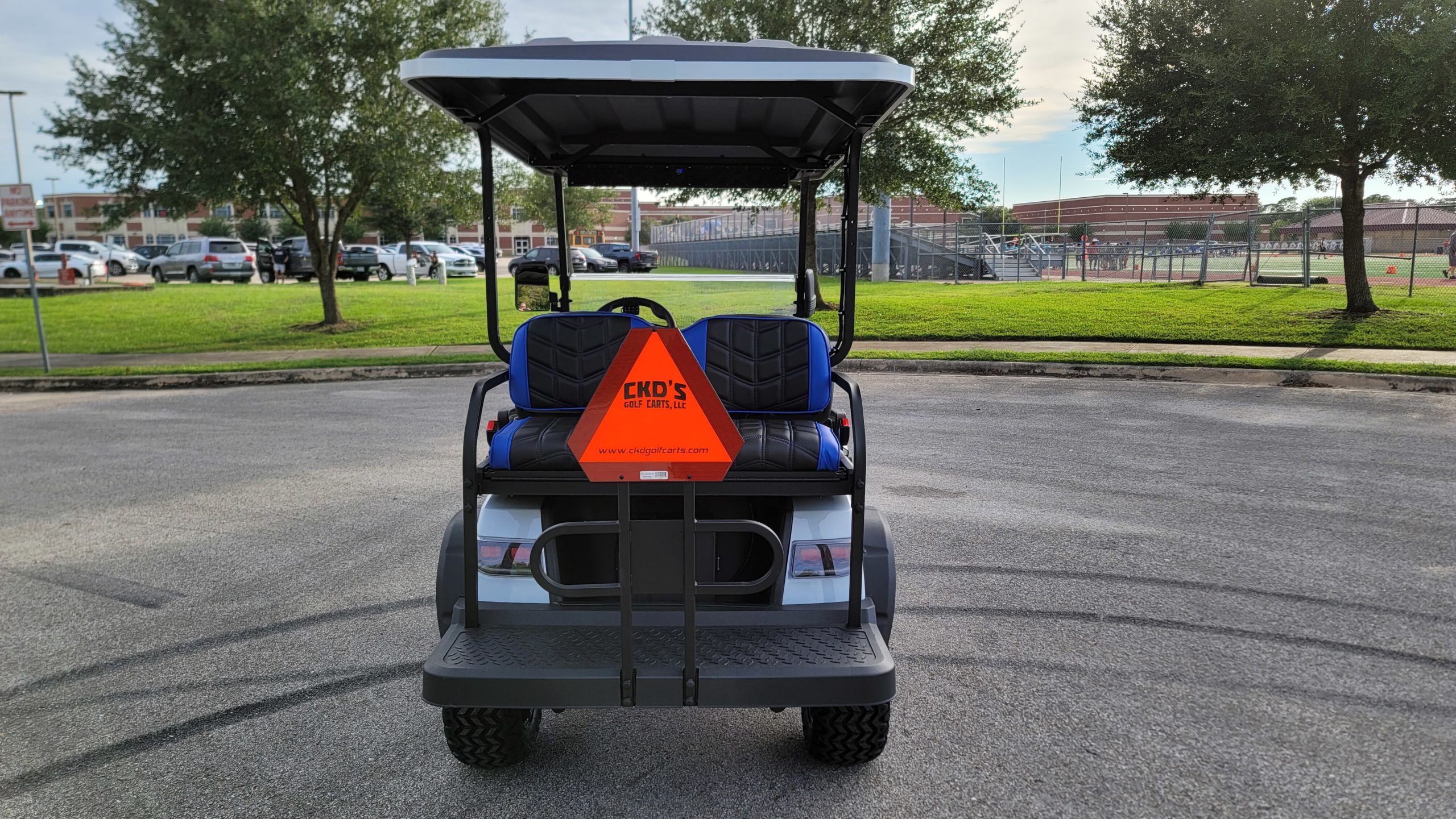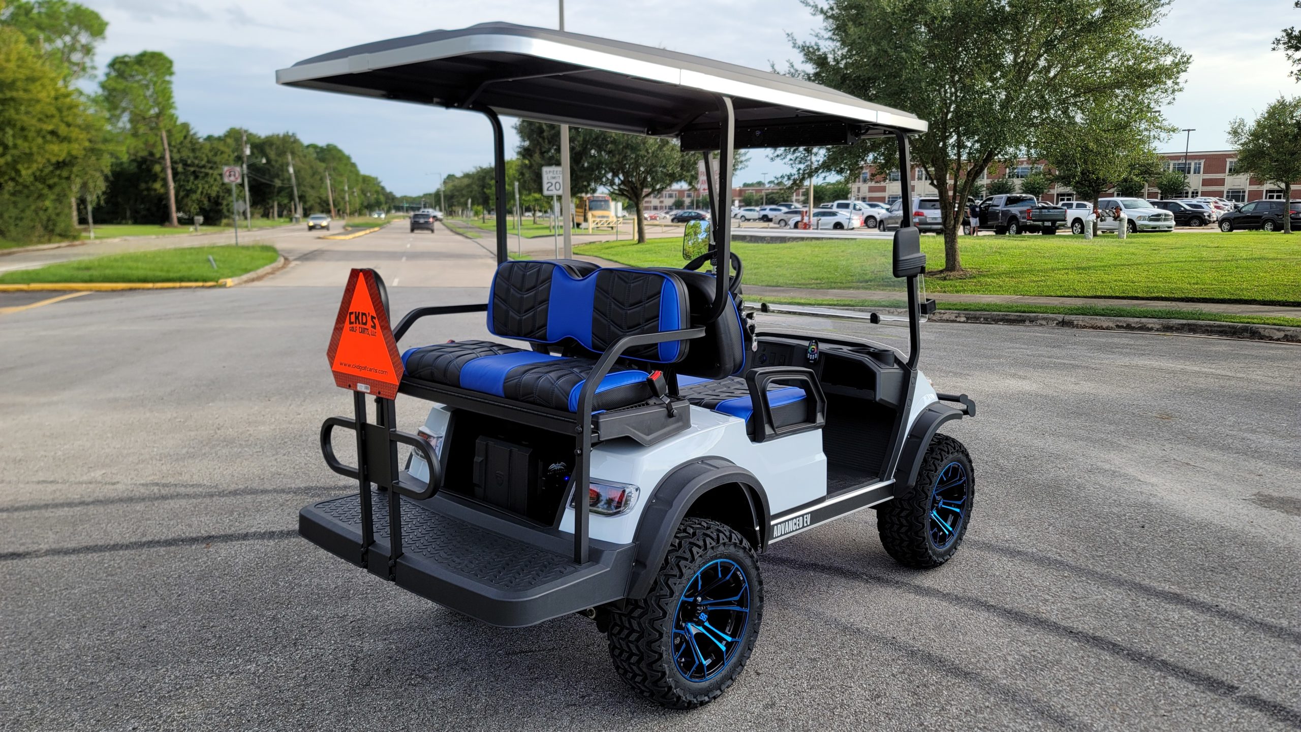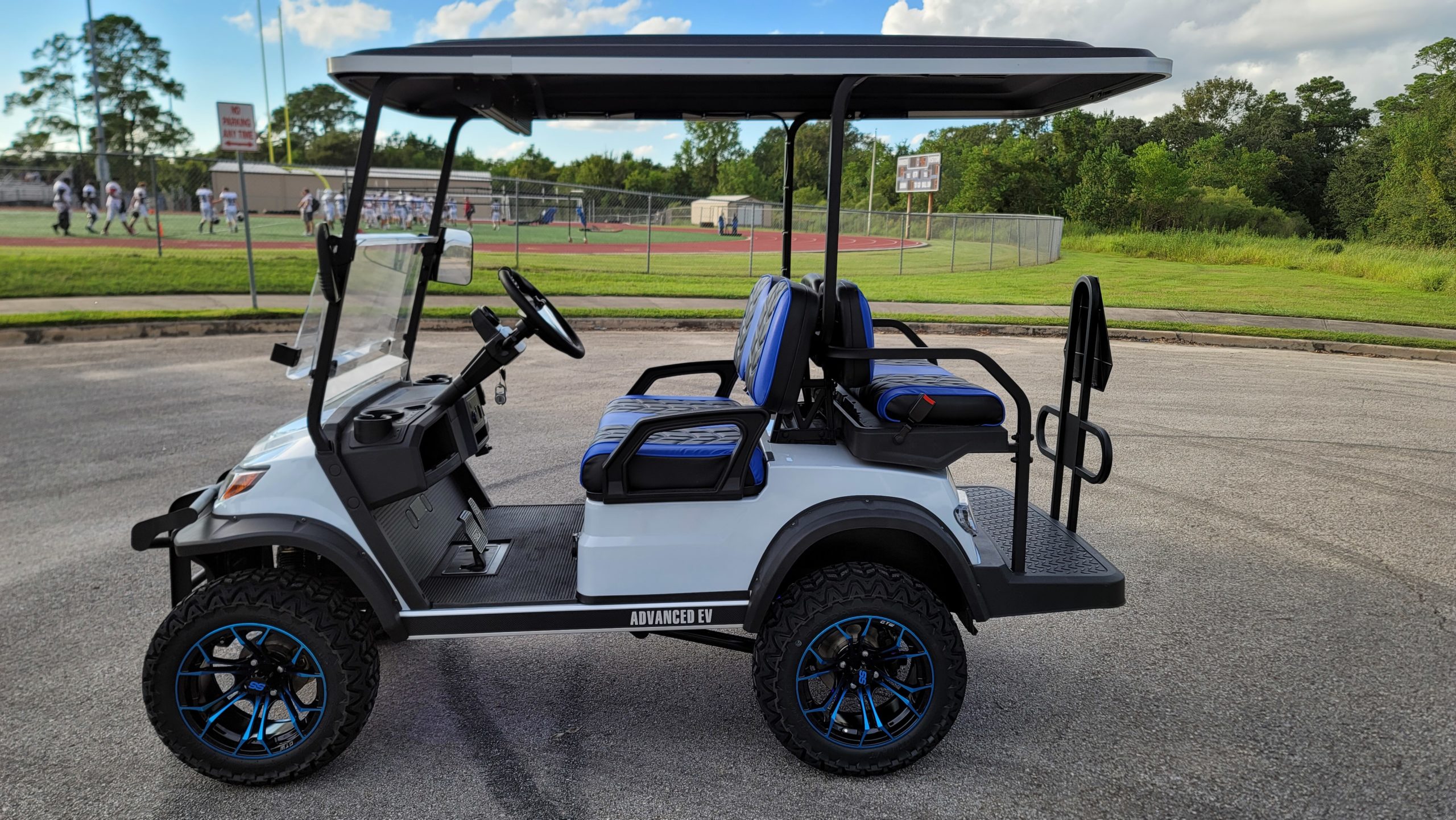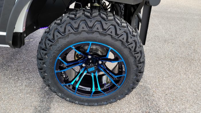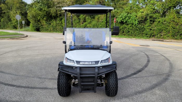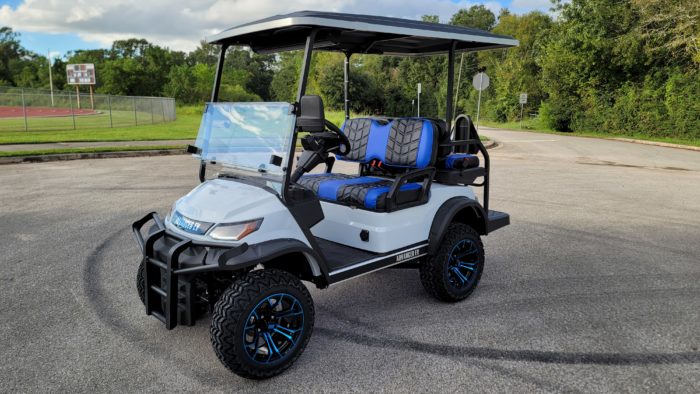 Brand New Special Edition Chalk White Metallic 2022 Advanced EV 2+2 four-passenger lifted golf cart and neighborhood cruiser. 48 volt AC drive with new Trojan Batteries, Curtis 350 amp AC controller & 4kW 5.5 hp motor, onboard charging system, powder-coated frame and chassis, 4-wheel coil spring over shock suspension, black long top with grab handles, rear flip seat with safety/grab bar and can add swinging cup holders. Ultimate LED Light Kit (includes headlights, taillights, brake lights, tum signals, emergency flashers, and a horn), digital speedometer, digital odometer, digital state of charge meter, dual USB outlets, side-mounted rearview mirrors, custom black and blue stitched seat upholstery, (4) retractable seat belts, 48 to 12-volt reducer, custom 14″ black and Blue GTW Spyder Wheels with 23″ Predator All-terrain Tires, fender flares, brush guard bumper, folding windshield, Wetsounds Stealth 10 Ultra HD paired with a Wetsounds AS-8 powered subwoofer, Wetsounds underbody RGB lights and SMV sign. This cart comes with a limited 2-year warranty!